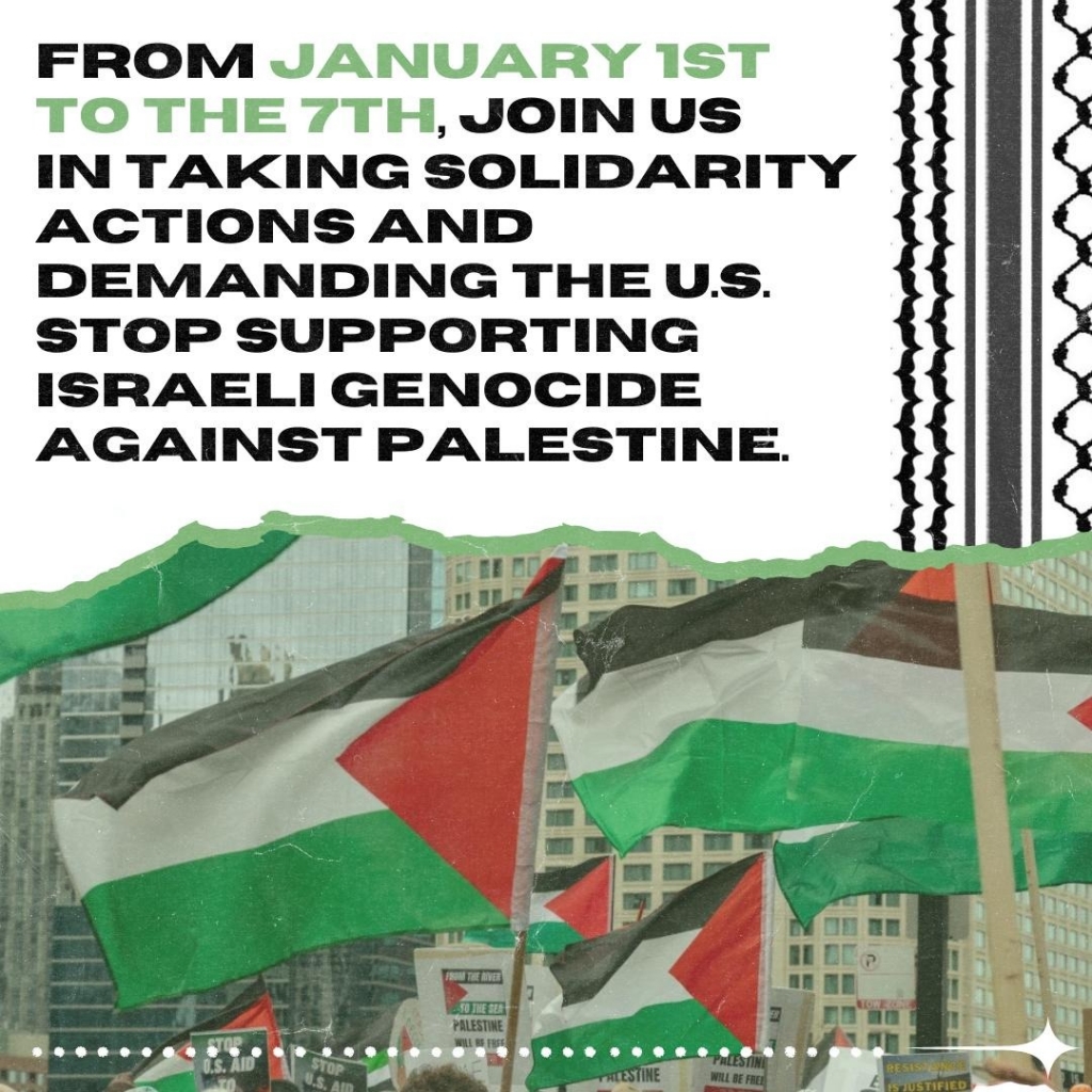 - We call on those in the movements for the freedom of Black and brown people in the US to start 2024 fighting for a free Palestine. From January 1st to the 7th, join us in taking solidarity actions and demanding the US stop supporting Israeli genocide against the Palestinian people.